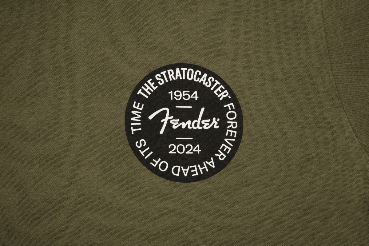 The Stratocaster 70th Anniversary Badge Tee is a great way to show your love for the iconic Strat! To celebrate Fender’s 70th anniversary of the Stratocaster they are introducing an olive-green t-shirt with a black commemorative 70th anniversary badge. The Stratocaster’s enduring legacy is a testament to the instrument’s timeless appeal and lasting impact on music culture. The 70th anniversary of the Stratocaster is quite a milestone and Fender is honoring this iconic guitar with our Stratocaster badge tee. Wear your new tee with pride, knowing you’re carrying a piece of musical history wherever you go!!