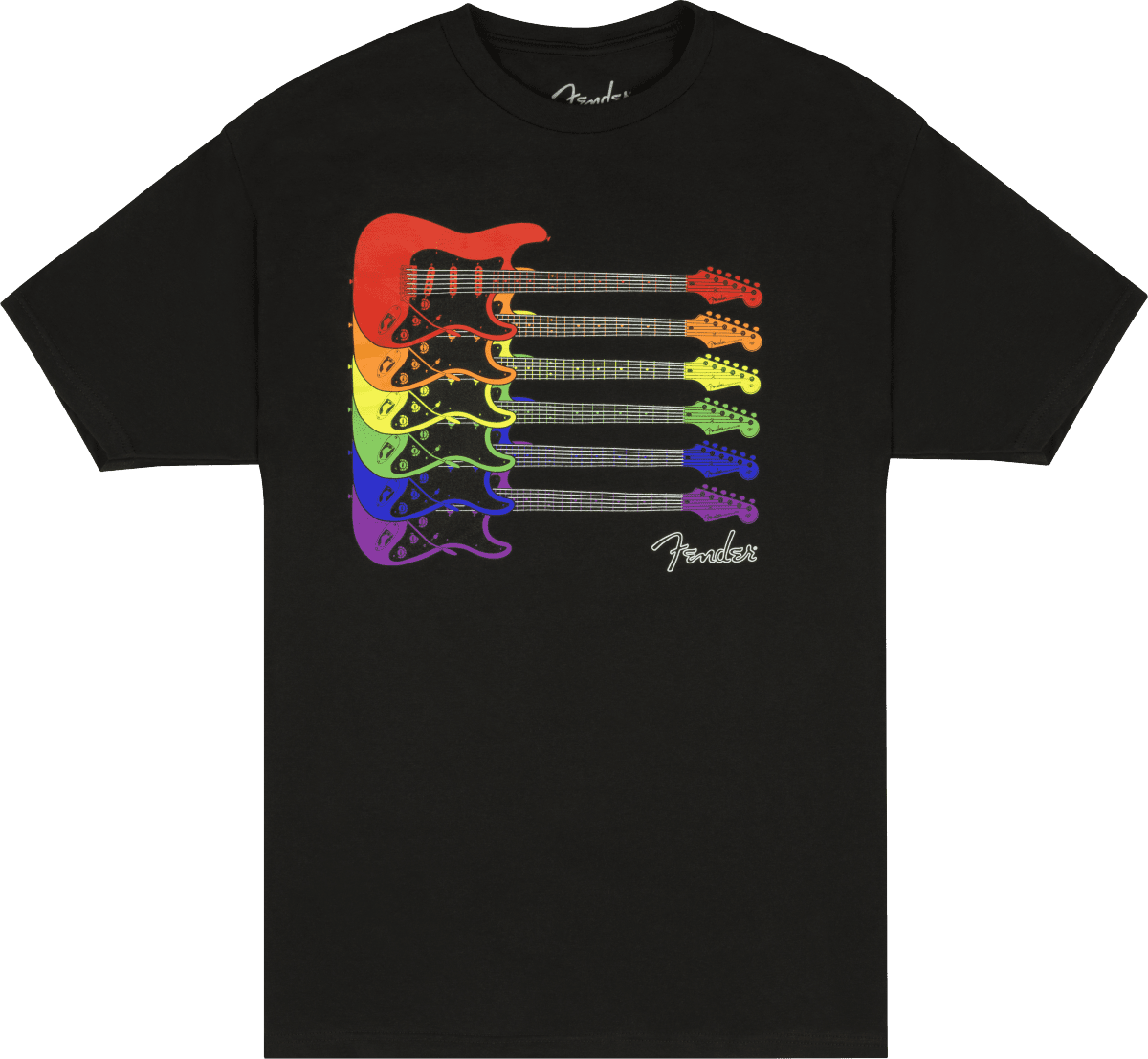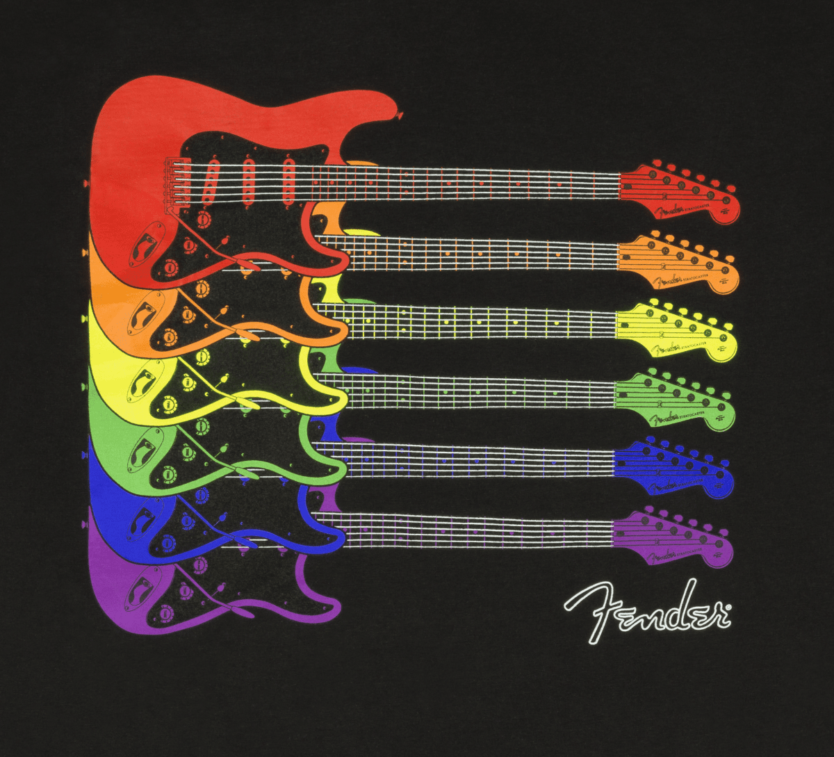 In honor of Pride Month, Fender has created a special T-shirt featuring six Stratocaster electric guitars in different colours celebrating the Pride flag.
