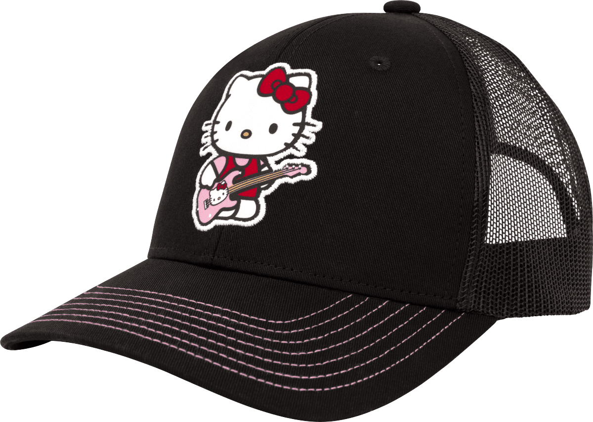 Featuring a custom graphic of Hello Kitty on the front panel of the hat. This adorable black, 6 panel, mesh back hat is the perfect accessory to elevate your outfit while expressing your love for Hello Kitty! This 6-panel mesh-back hat features a custom Hello Kitty design on a sublimated patch, with pink stitching on the front of the visor. The hat includes an adjustable strap for easy sizing and is available in black only. The sizing is one-size-fits-most.