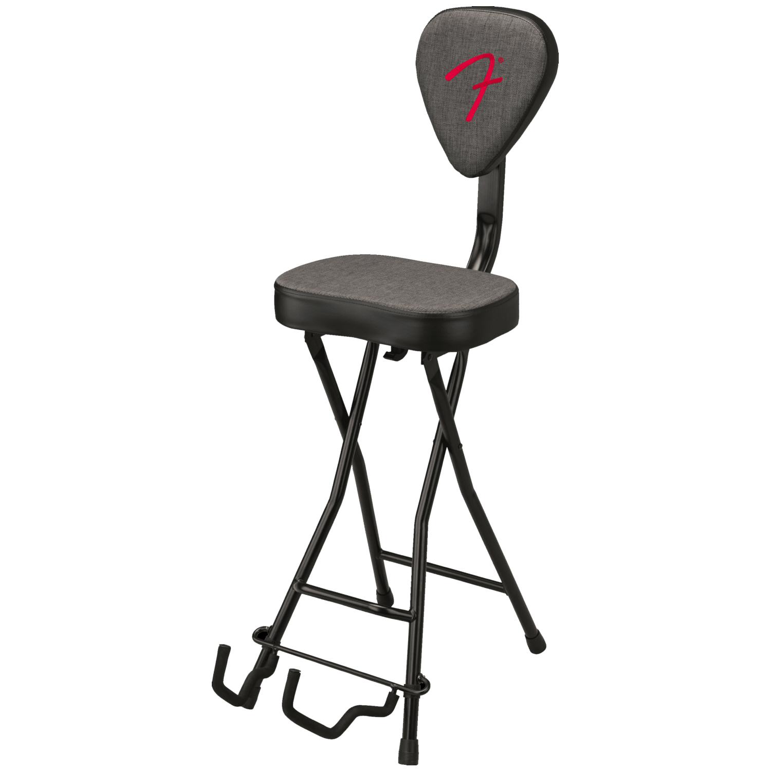 Comfortably padded for long playing sessions, the seat and Fender 351 pick-shaped backrest with embroidered “F” logo are covered in woven gray tweed fabric.