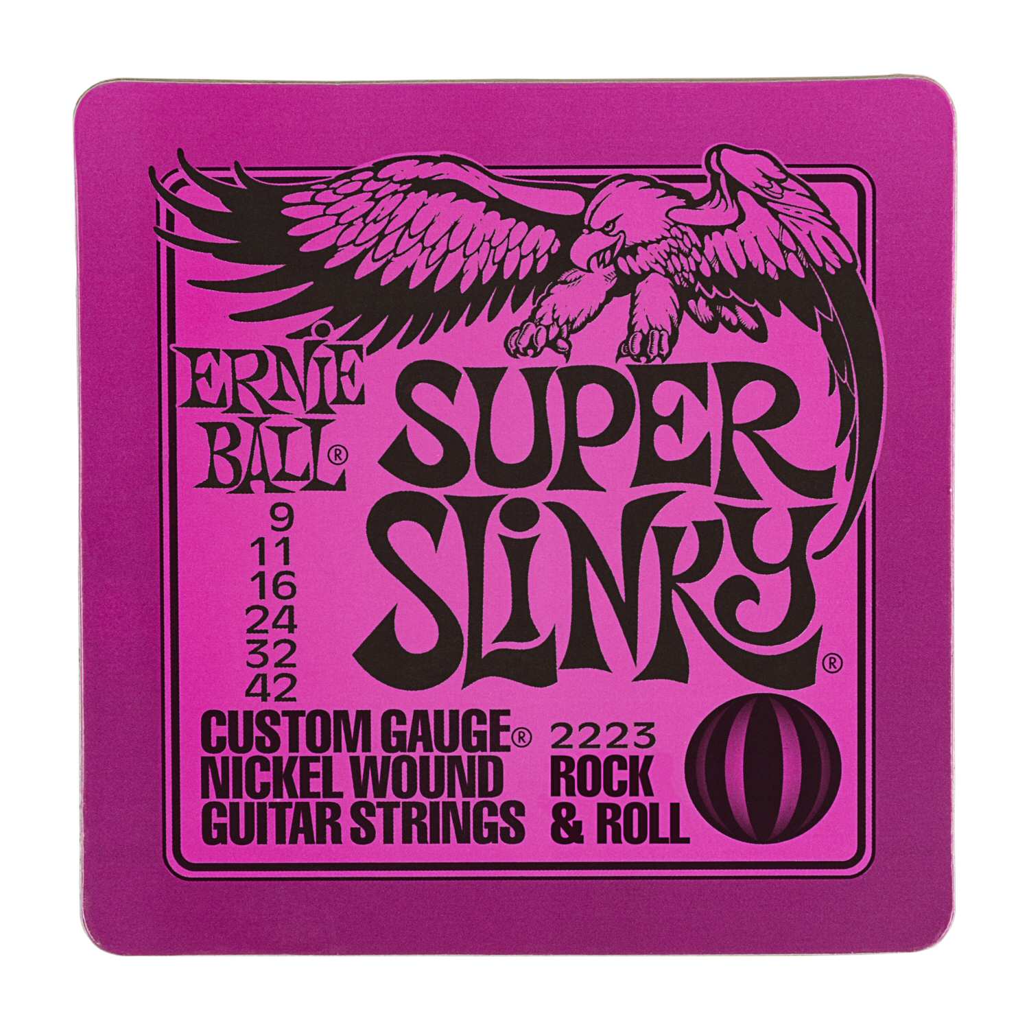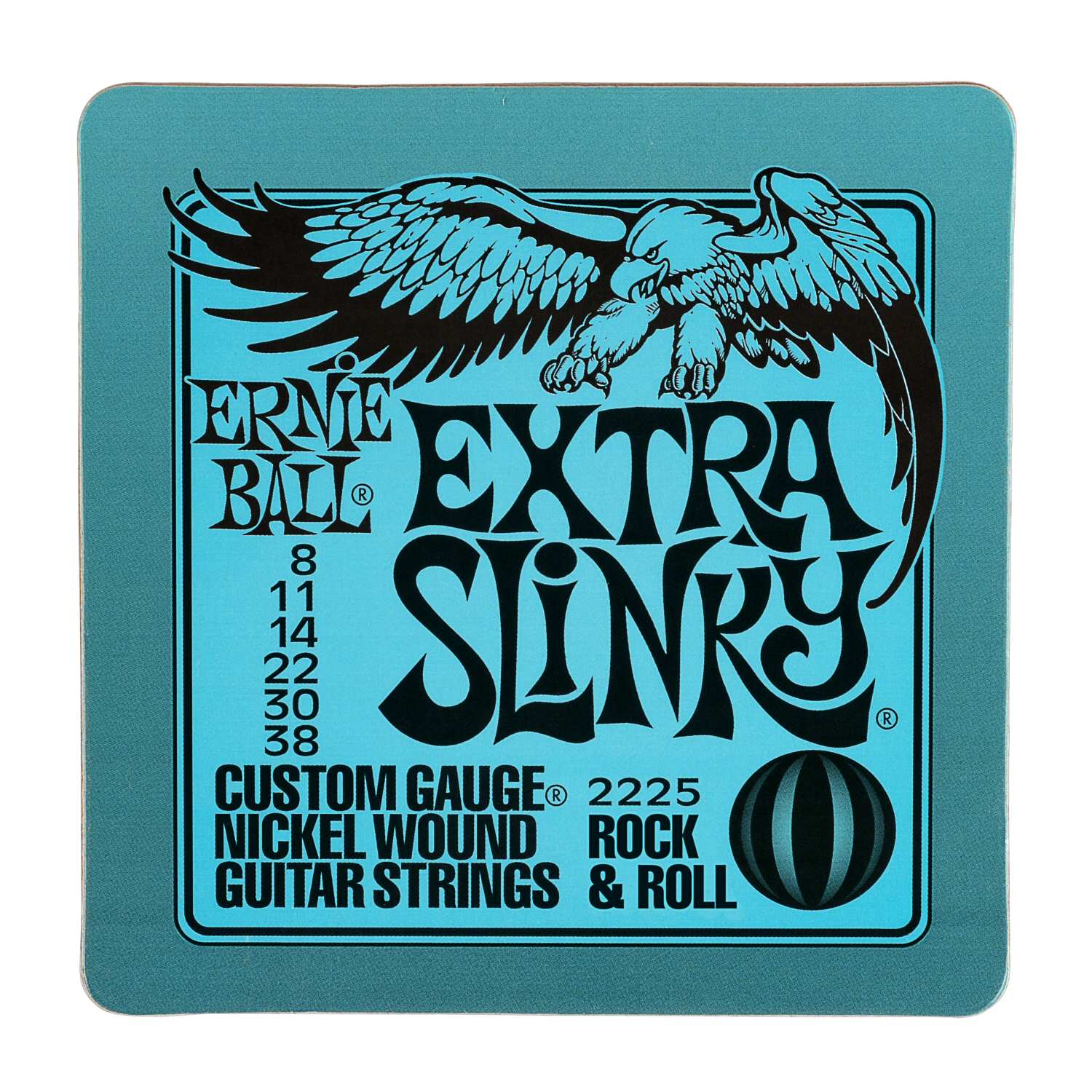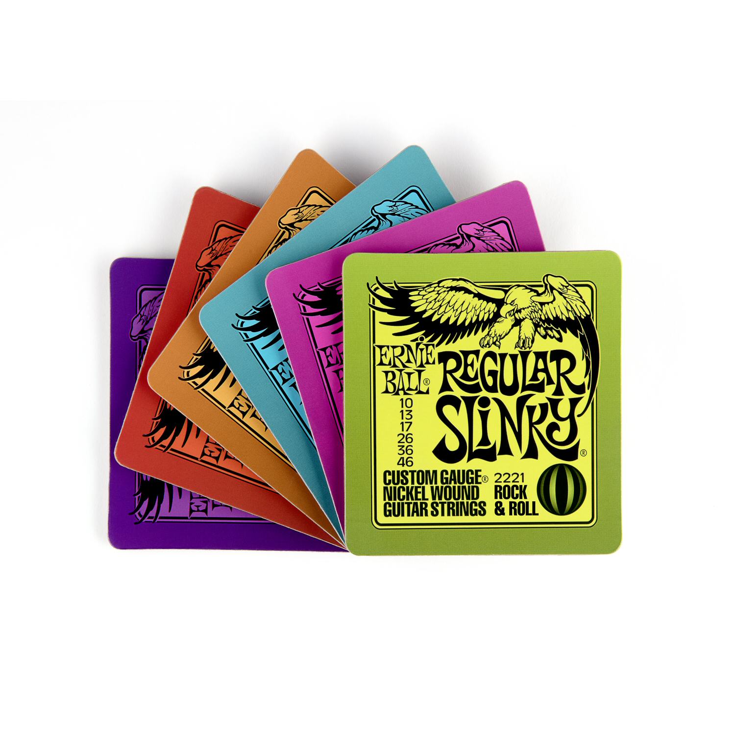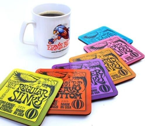 This six pack of quality Ernie Ball Slinky-themed drink Coasters (Extra, Super, Hybrid, Regular, Skinny-Top Heavy-Bottom and Power Slinky) are cork backed & packed in a clear PET box.