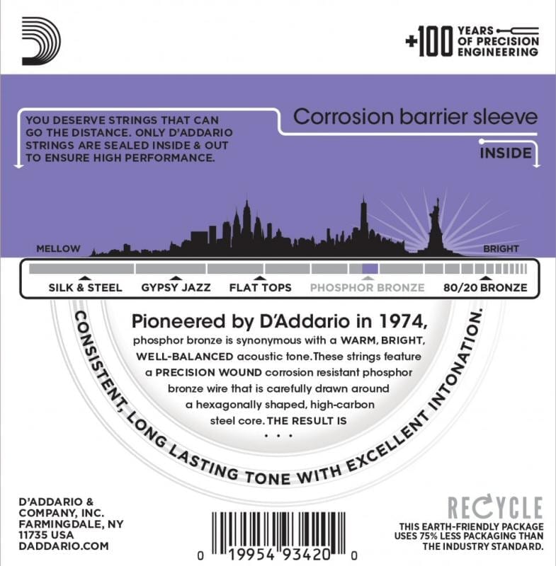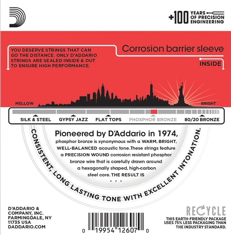D’Addario Phosphor Bronze strings are precision wound with corrosion resistant phosphor bronze onto a carefully drawn, hexagonally shaped, high carbon steel core. The result is long lasting, bright sounding tone with excellent intonation.