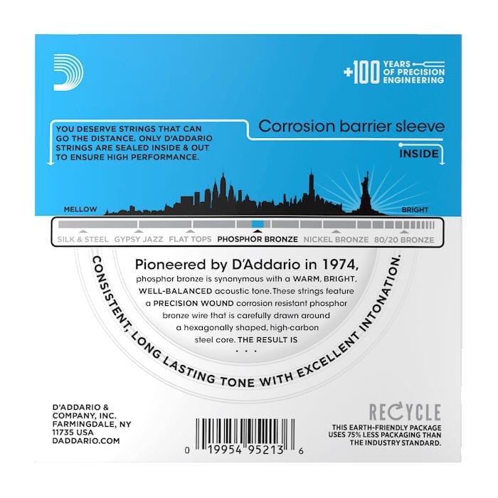 D’Addario Phosphor Bronze strings are precision wound with corrosion resistant phosphor bronze onto a carefully drawn, hexagonally shaped, high carbon steel core.