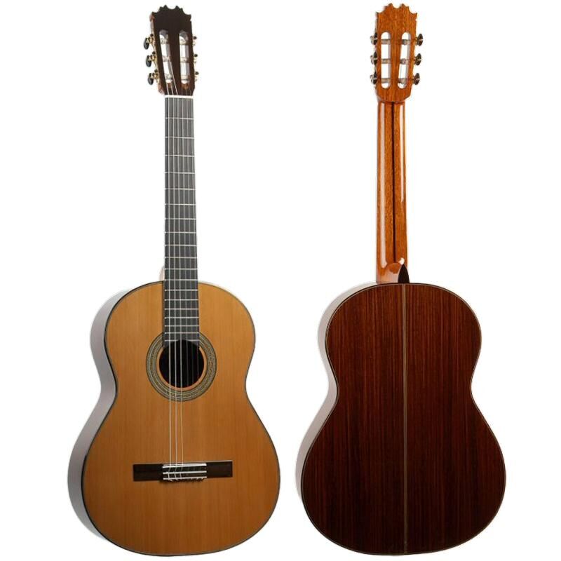 It boasts high-quality woods, such as solid cedar or spruce pine for the top and neck, and laminated Indian rosewood for the back & sides. Ebony is utilised on the fingerboard and neck bracing. In addition, the guitar has a bone saddle and nut and professional Der-jung gold machine heads.