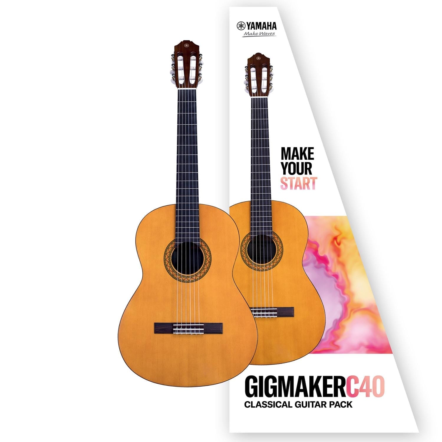 This GigmakerC40 Classical guitar pack includes a full-sized Yamaha C40 nylon string acoustic guitar and a clip-on tuner. The C40 is recommended by many teachers around the world as one of the best nylon string guitars for students to start learning on.