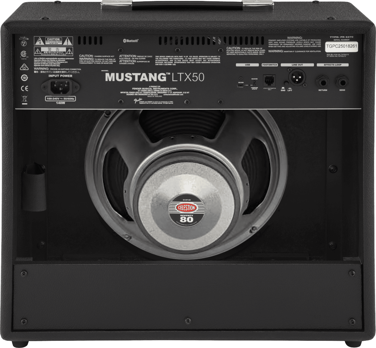 Mustang LTX 50 is ideal for practice or performance with a 12″ Celestion G12P-80 speaker and an optional gig-ready 5-button footswitch. Onboard Bluetooth allows you to jam along with your favorite songs as well as create, edit, download and share presets using the Fender TONE app.