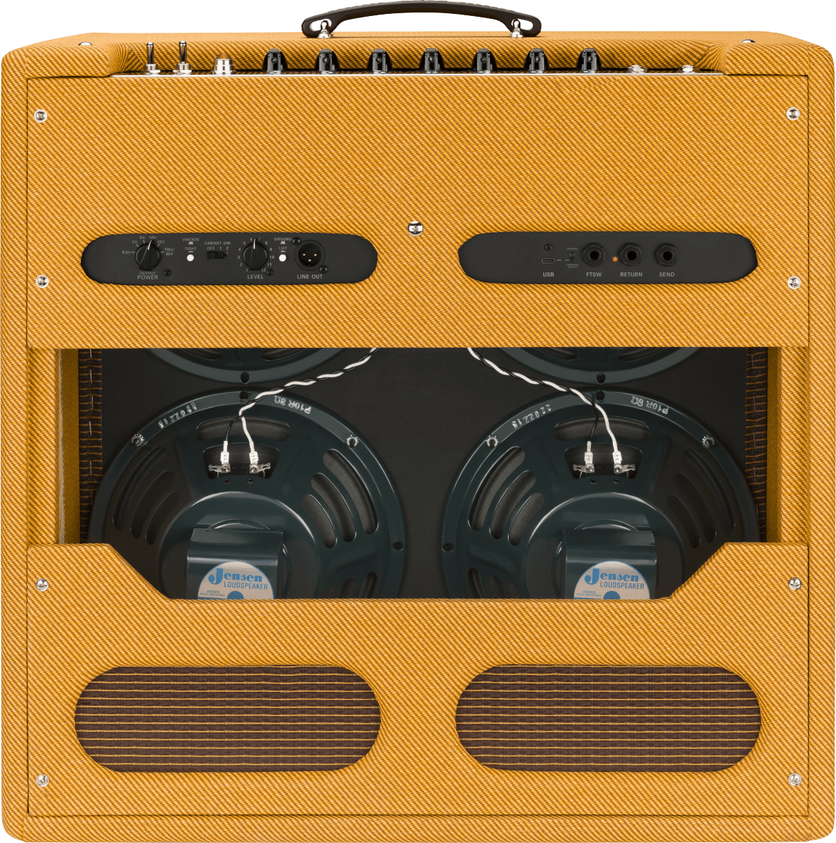 This impressive Fender technology includes four Jensen® P-10R speakers. It also features player-friendly additions like convolution spring reverb. A vintage/tight switch offers smoother bass response, and a post-power amp effects loop enhances versatility. Other features include an output power selector with five attenuated settings. It also has an impulse response (IR) XLR line output for detailed cabinet simulations, a mute switch, and a lightweight pine cabinet.