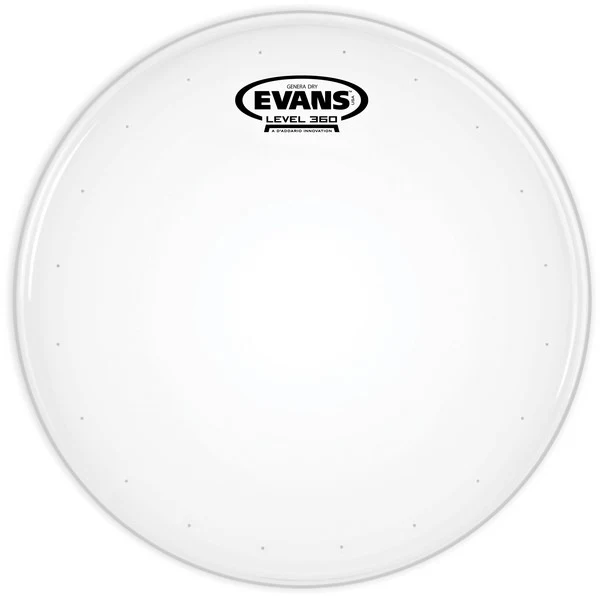 Evans Genera Dry snare heads deliver a well-focused, yet natural tone. Made with a single ply of coated 10mil film, a 2mil overtone control ring, and precision-drilled dry vents, this head responds like a single ply while eliminating any lingering overtones. Genera Dry snare batters provide a balanced attack, short sustain, and dark tone, plus the added durability of Evans premium coating. This coated head also features Level 360 Technology.