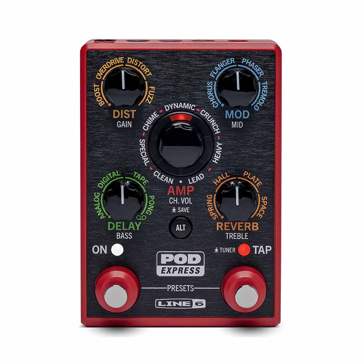 The ultra-portable Line 6 POD Express Guitar amp and effects processor enables you to take your tones wherever. Simple controls make it easy to use, while the HX processor makes it sound amazing! POD Express Guitar includes seven amps, seven cabs, and 17 effects, and can be powered by three AA batteries (included) or an optional 9-volt power supply. Additional features include stereo outputs, tap tempo, a tuner, a noise gate, a headphone output, and a USB-C audio interface with re-amping capabilities. Add an optional expression pedal for volume control, or up to two footswitches to select presets or turn effects on and off.