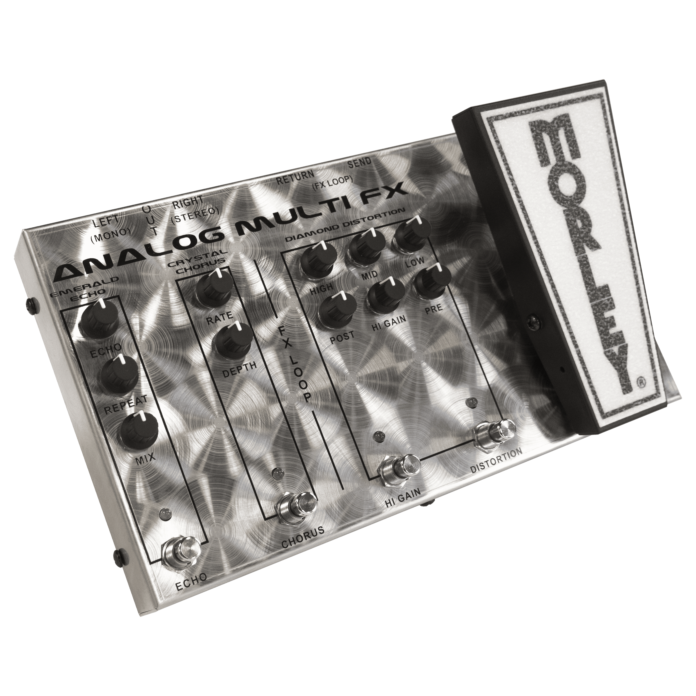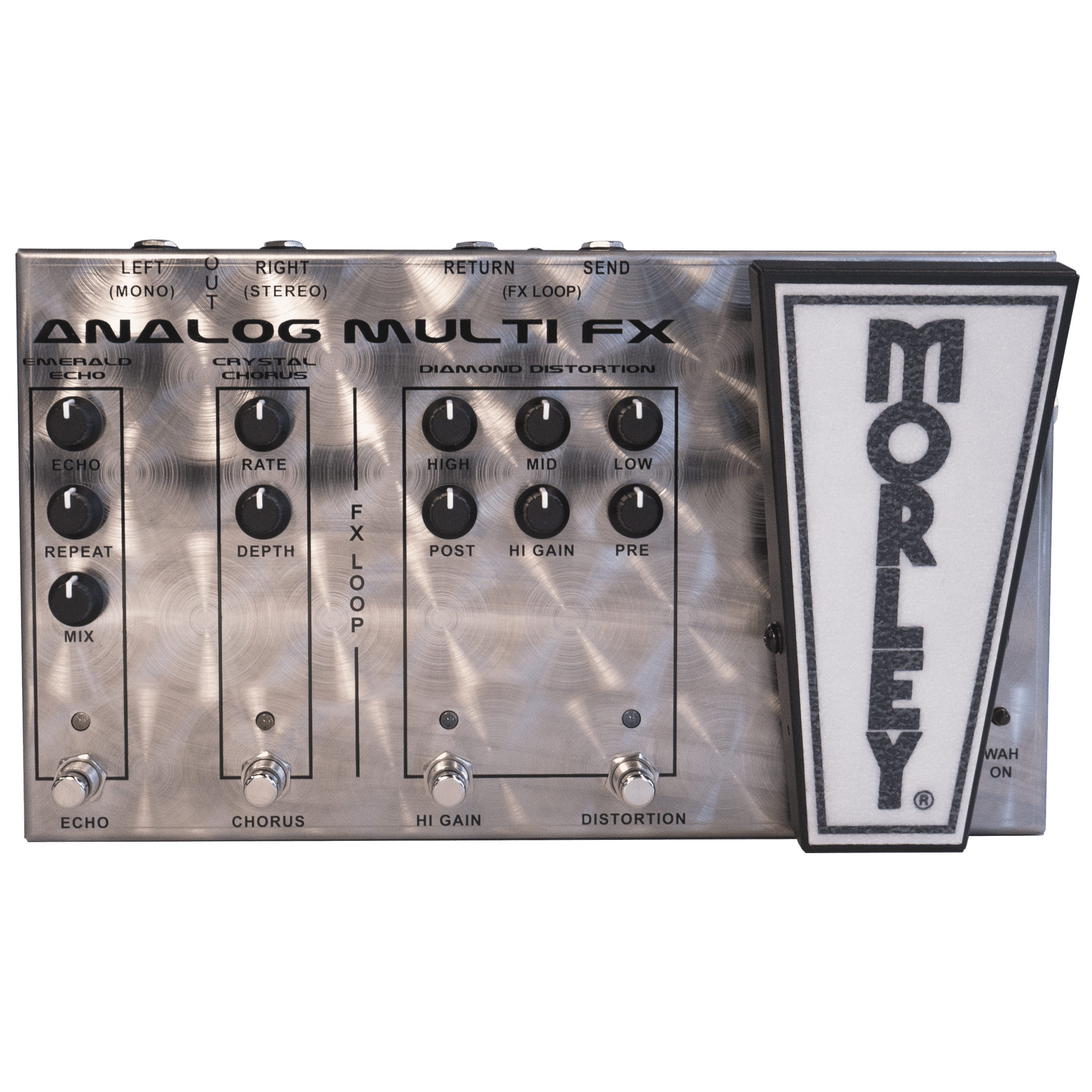 The Morley AFX-1 Analog Multi FX is an Authentic Analog Multi Effects Pedal equipped with everything you need to get the job done on stage and in the studio. It’s got a Switchless Optical Wah, Distortion, Effects Loop, Stereo Chorus, and Echo. Even better, these are reissues of classic Morley circuits leading all the back to the 1970’s. And speaking of the 70’s, it also has a new finish that pays homage to the original chrome Morley pedals. It’s Heavy-Duty spun stainless steel, that’s Built like a Tank, and looks great under stage lights. Each one is hand spun at Morley’s Illinois facility.