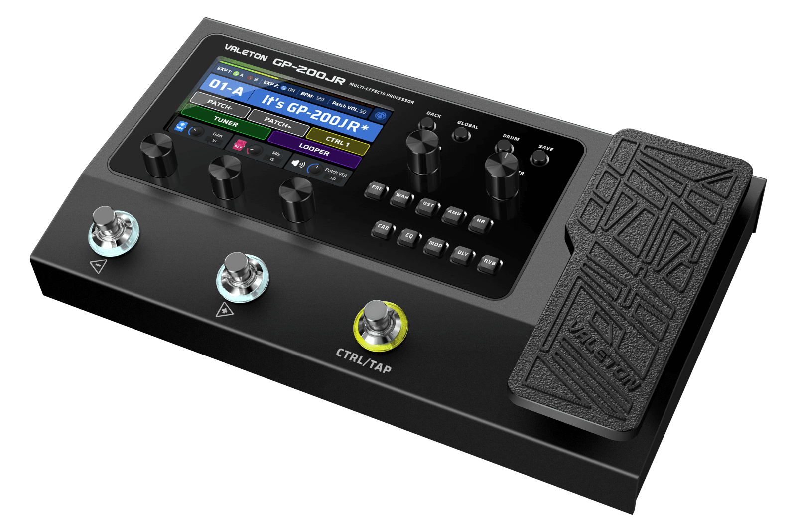 Easily adjust which pedals are in your signal chain, and their order, with up to 11 simultaneous effects, via the 4.3″ TFT colour LCD screen using Valeton’s user-friendly UI. Select from 100 built-in drum machine rhythms, or use the 180 second looper, and 255 Tone Profiles to craft a huge range of tones. Assign the expression pedal to control up to 3 effect parameters. The GP-200JR even has a built-in chromatic tuner, to make sure you’re never out of tune. The GP-200JR also features 3 customisable backlit footswitches for ease of use on the darkest of stages.