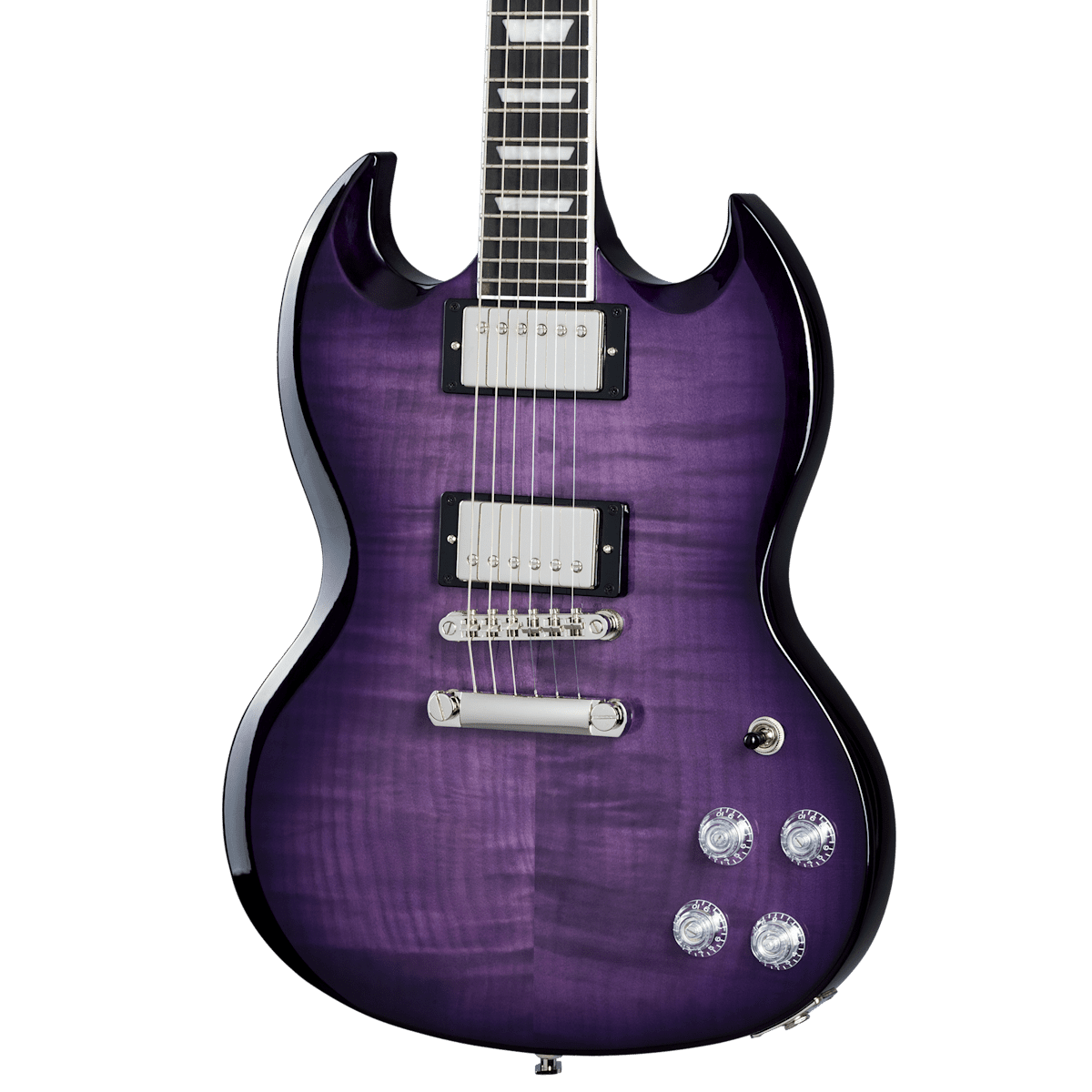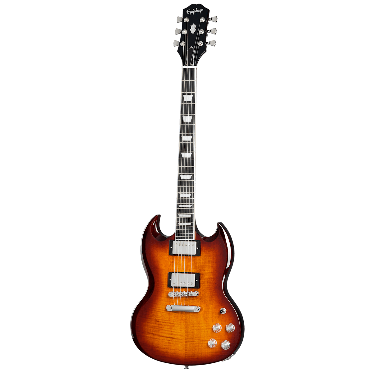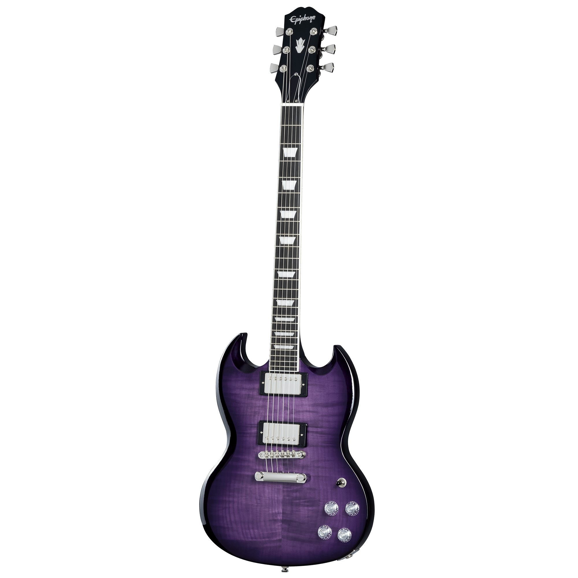 The Epiphone SG Modern Figured from Epiphone’s Inspired by Gibson™ Collection has the classic SG™ body profile made from mahogany and a 3/4” maple cap with an AAA-figured maple veneer. Powered by a pair of Epiphone’s ProBucker™ humbucker™ pickups with coil-splitting, phase switching, and a treble bleed circuit for a multitude of tones. It also features an ebony fingerboard, asymmetrical SlimTaper™ neck profile, world-class Grover® Locking Rotomatic® 18:1 ratio tuners, Posi-Lok™ strap buttons, and a Graph Tech® NuBone® nut. A premium gig bag is included.