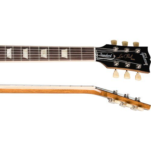 The Gibson Les Paul Standard 50’s has a solid mahogany body with a maple top. The rounded 50’s-style mahogany neck boasts a rosewood fingerboard and trapezoid inlays. Equipped with an ABR-1 classic-style Tune-O-Matic bridge and aluminum stop bar tailpiece, plus keystone vintage deluxe tuners and aged gold top-hat knobs. The calibrated Burstbucker pickups are loaded with AlNiCo II magnets, which are handwired along with audio taper potentiometers and orange drop capacitors.