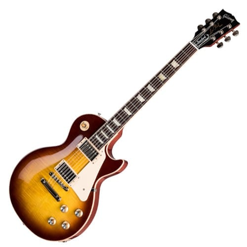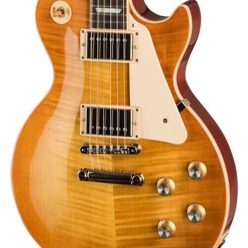 These awesome electric guitars boast a solid mahogany body capped with a stunning AA figured maple top. The slim taper 60’s-style mahogany neck feels great to play & boasts a rosewood fingerboard and trapezoid inlays. It’s equipped with a classic-style Tune-O-Matic bridge, aluminum stop bar tailpiece, Grover Rotomatic “Kidney” tuners, and gold top hat knobs with silver reflectors. The 60s Burstbucker pickups are loaded with Alnico 5 magnets and wired to audio taper potentiometers and Orange Drop capacitors. Of course, these guitars include a genuine Gibson hard case as well.