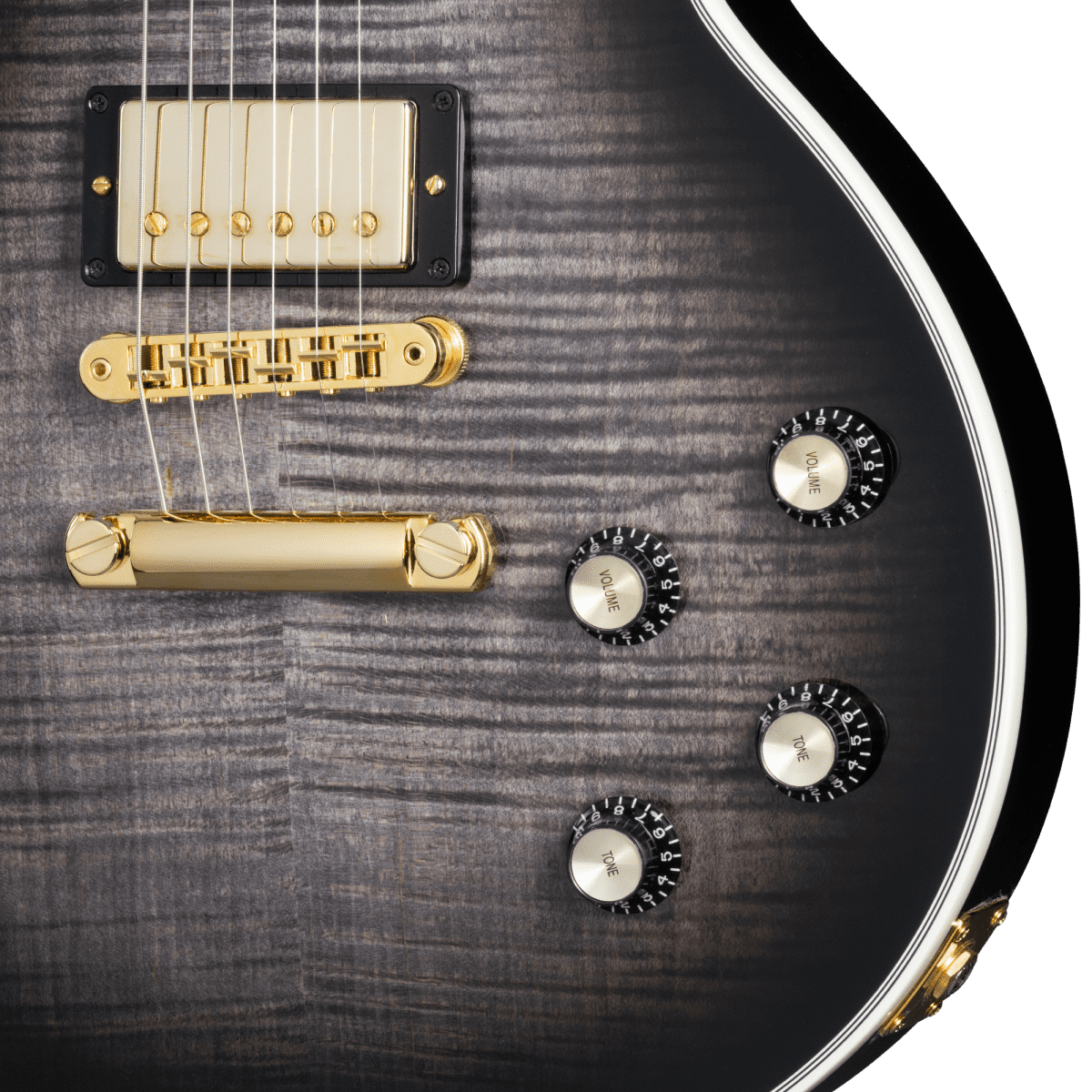 The pickups —Burstbucker Pro and Burstbucker Pro+— utilise push/pull Volume and Tone potentiometers, offering flexible coil tap, phase, and Pure Bypass switching for a virtually limitless range of tones.