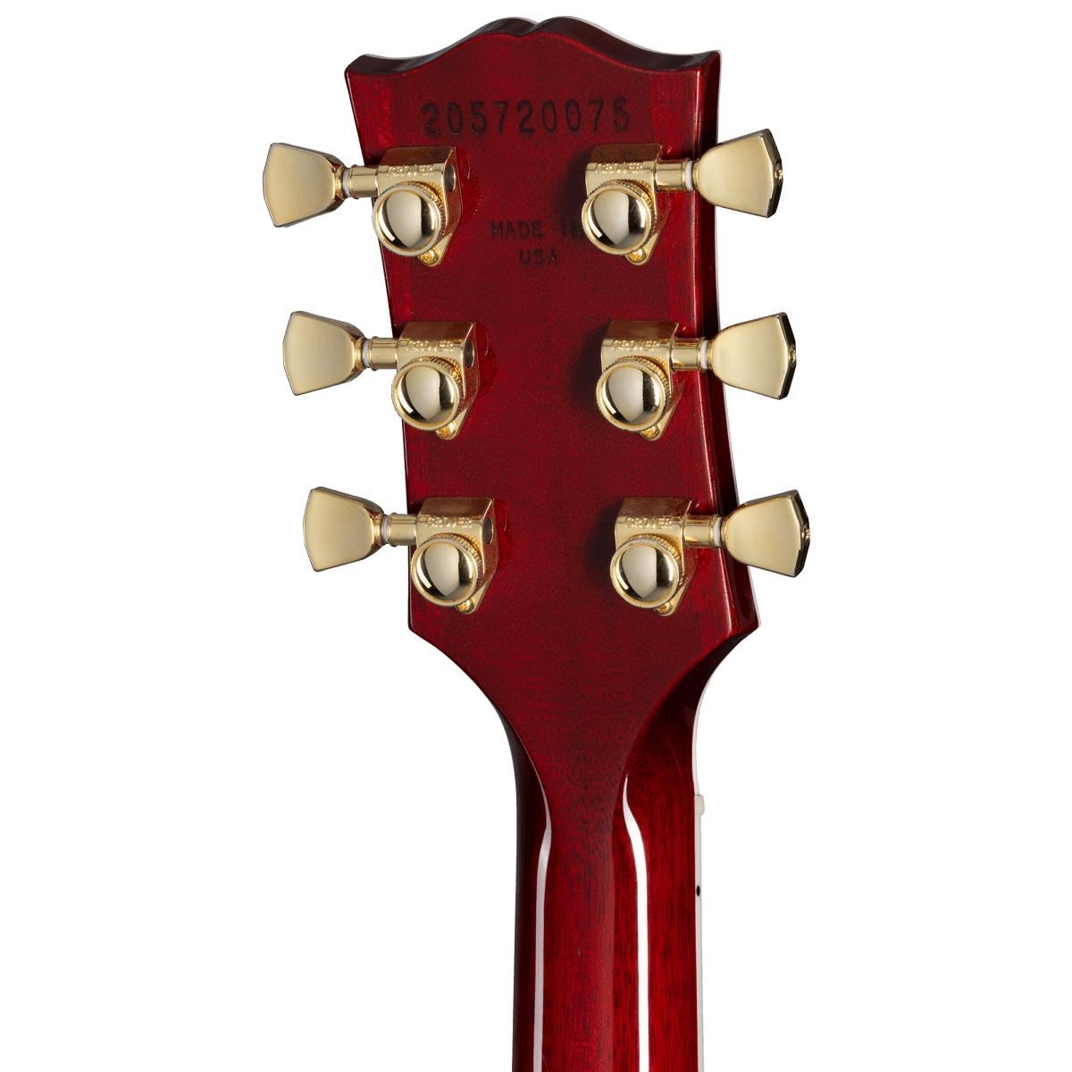 This incredible electric guitar boasts a stunning AAA-figured maple top on a mahogany body, enhanced with Ultra-Modern Weight Relief. The mahogany neck features a compound radius Ebony fretboard, decorated with Super Split Block mother-of-pearl inlays. Additionally, the neck includes a Modern Contoured Heel for exceptional upper fret access. The headstock showcases a striking new mother-of-pearl inlay, inspired by a 1940s design found in the Gibson archives.