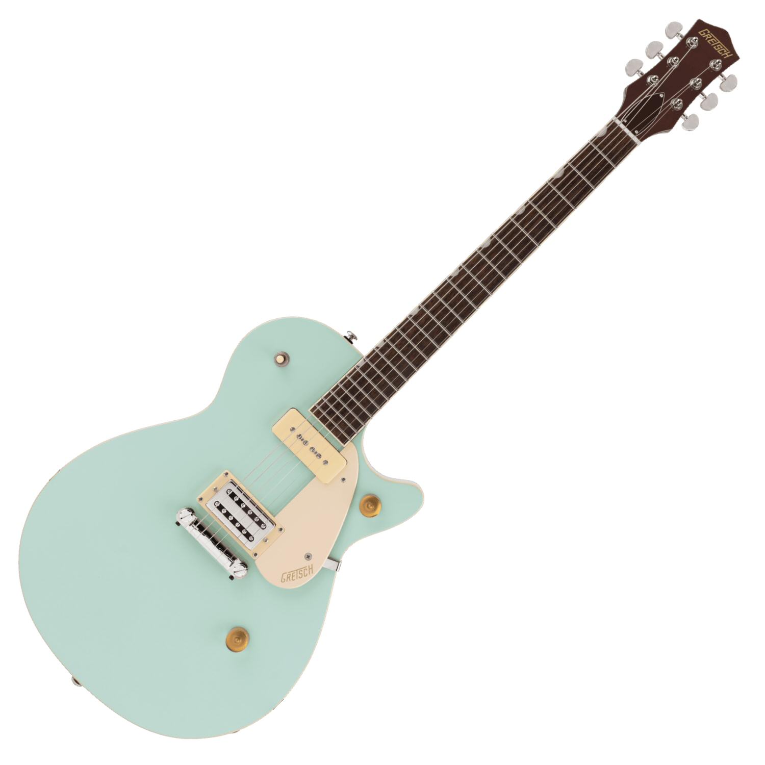 The G2215-P90 also features an anchored compensated wrap-around bridge, gold Electro-style control knobs, cream pickguard and nickel hardware.