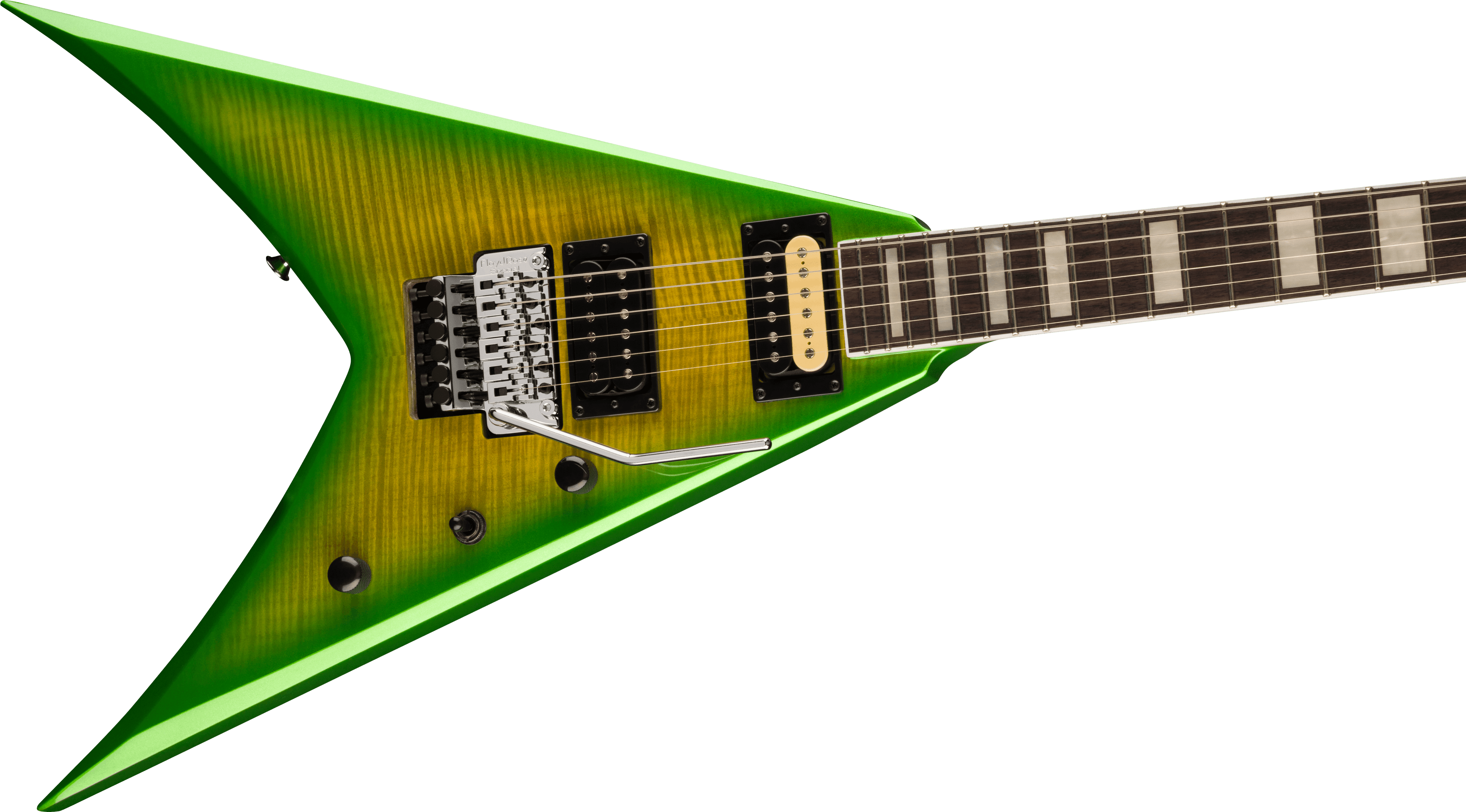 Brand: Jackson Series: X Body: Nyatoh Body Finish: Gloss Body Top: Flame Maple Body Shape: King V™ Control Knobs: Dome-Style Fingerboard: Rosewood Hardware Finish: Black Position Inlays: Pearloid Block Neck Finish: Gloss Color Matched Neck Construction: Neck-Through-Body with Graphite Reinforcement and Scarf Joint Neck Pickup: Jackson® High-Output Humbucking Side Dots: Black Headstock: Jackson® Pointed 6-In-Line Headstock Binding: 1-Ply White Orientation: Right-Hand Configuration: HH String Nut: Floyd Rose® R3 Locking Truss Rod Wrench: Yes Bridge Pickup: Jackson® High-Output Humbucking Controls: Volume, Tone Pickup Switching: 3-Position Toggle: Position 1. Bridge Pickup, Position 2. Bridge And Neck Pickups, Position 3. Neck Pickup Pickup Configuration: HH Bridge: Floyd Rose® Special Double-Locking Tremolo (Recessed) Tuning Machines: Jackson® Sealed Die-Cast Strings: Nickel Plated Steel (.009-.042 Gauges) Case/Gig Bag: Optional Jackson® King V™/Rhoads Multi-Fit Molded Case, Black (p/n299-6101-506); Optional Jackson® Rhoads RR 6/7 Molded Case (p/n 299-7774-100) Fingerboard Radius: 12″ to 16″ Compound Radius (304.8 mm to 406.4 mm) Refinement Fingerboard Radius: Compound Fret Size: Jumbo Neck Material: Maple Refinement Neck Material: Maple Number of Frets: 22 Nut Material: Floyd Rose® R3 Locking Nut Width: 1.6875″ (42.86 mm) Scale Length: 24.75″ (629 mm) Truss Rod: Dual-Action Head Adjust Truss Rod Nut: Truss Rod Adjustment at Nut Style: 2 Humbucking