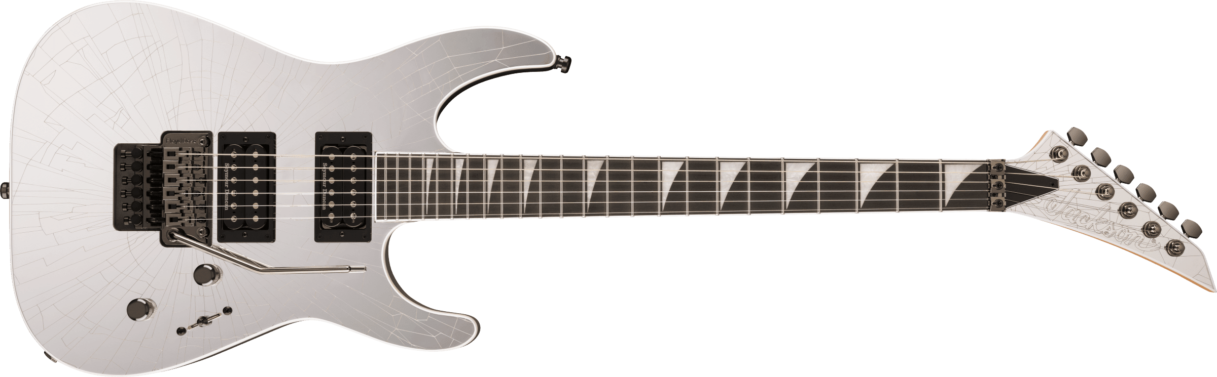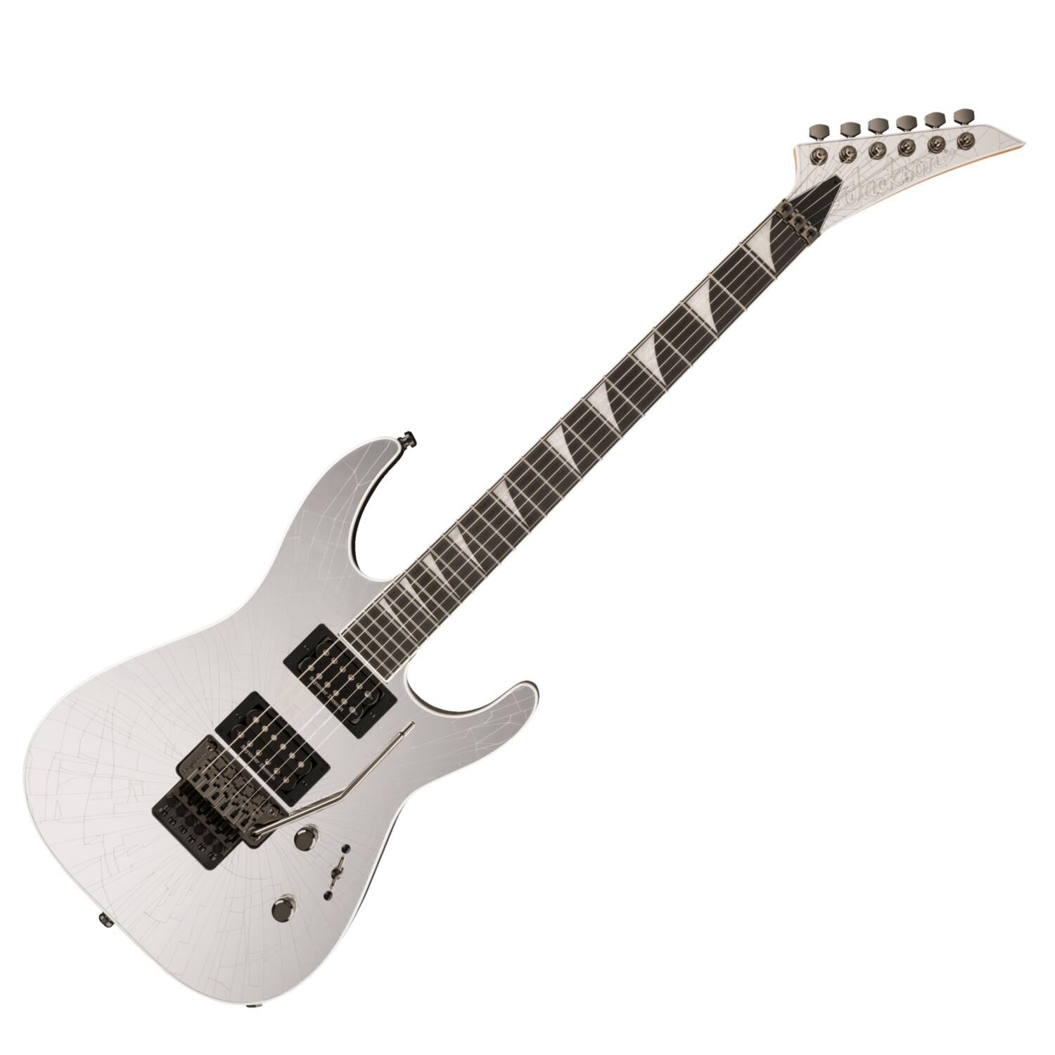 - Available in Shattered Mirror with matching reverse Jackson pointed 6-in-line headstock, white body binding and black chrome hardware