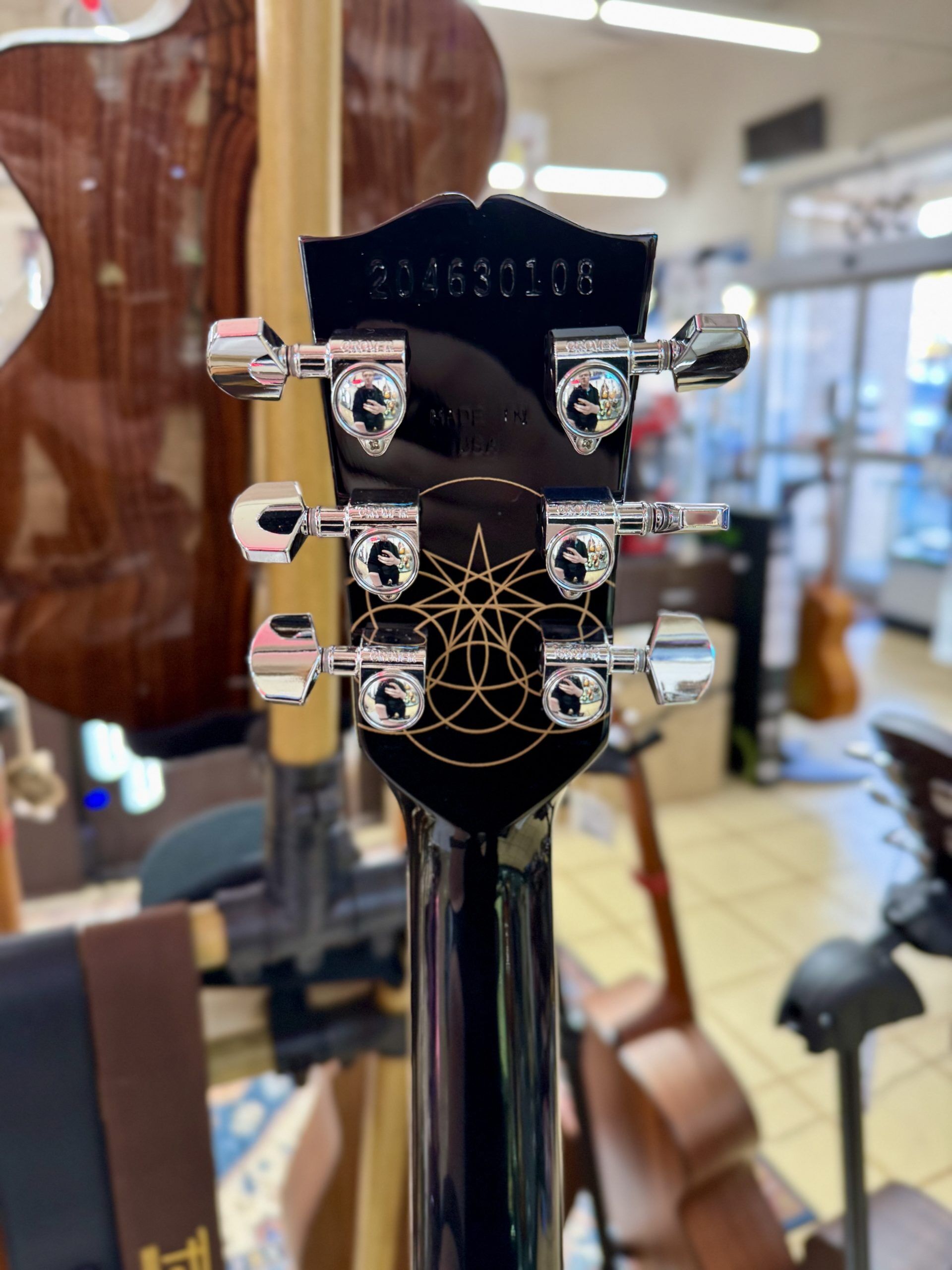 The mahogany neck has a Rounded profile, offering comfort and control for both fluid leads and crushing power chords. Additionally, the ebony fretboard provides a sleek, fast-playing surface for effortless fretting and dynamic expression. Grover® Rotomatics® tuners ensure excellent tuning stability across sessions, gigs, or long practice hours. A modern hardshell case protects your instrument during transport, whether you’re heading to the studio or stage. Adam Jones’s signature touches appear on the truss rod cover and the headstock’s back, featuring custom artwork and his autograph. This adds a distinctive, collectible element that fans and gear enthusiasts will instantly appreciate.