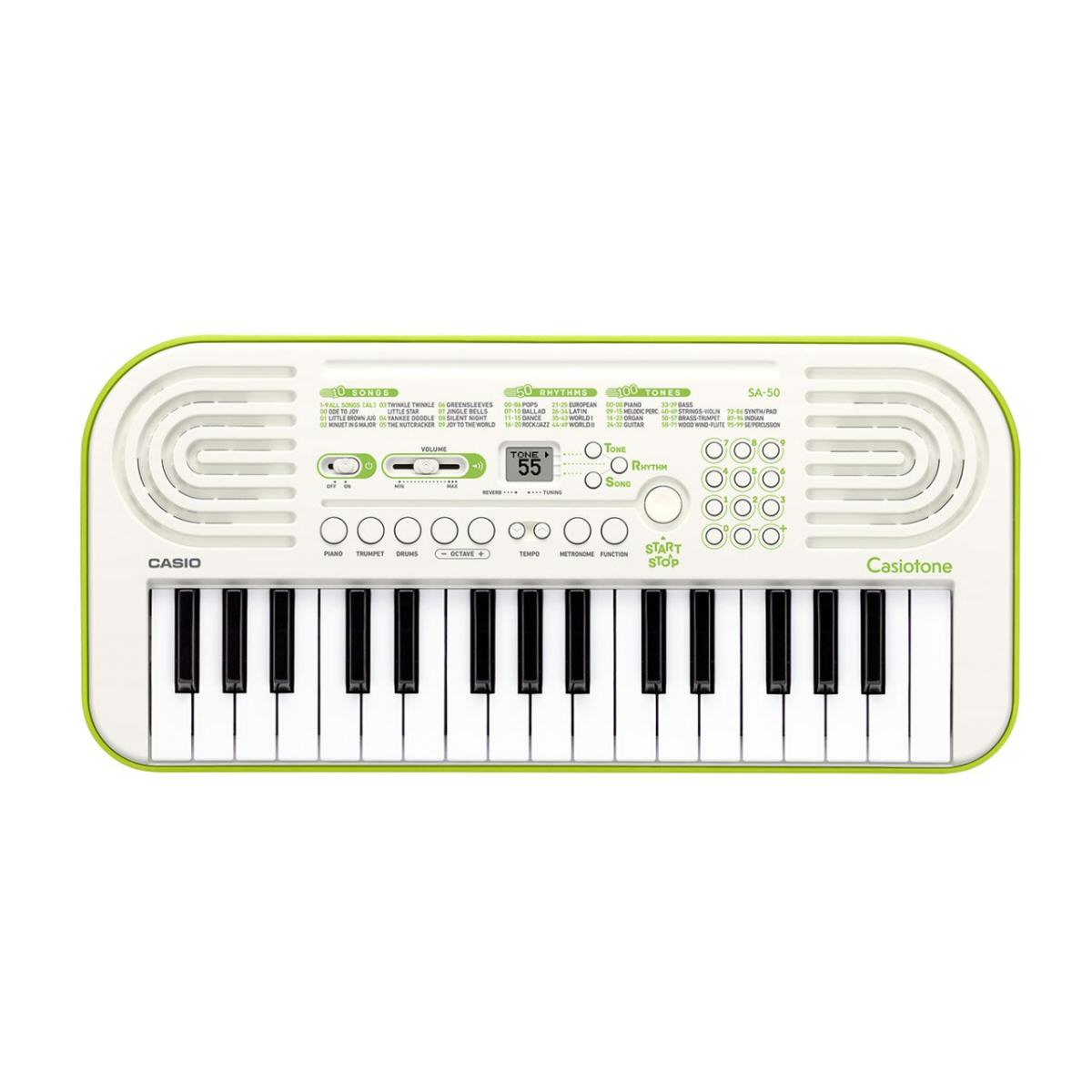 The Casio SA-50 mini keyboard has a compact body packed with beautiful tones, rhythms and functions. 32 mini keys make it easy to play, even for small hands.