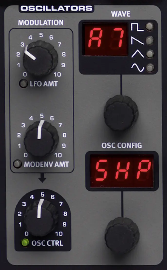 - Pitch, Detune, Shape, Sync, AM, Noise, Sub Mix, FM
